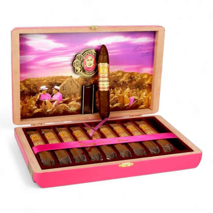 Arturo Fuente’s Rare Pink Vintage “Happy Ending” is a nostalgic journey back to the golden era of wrapper artistry. Rolled using pink-hued, stogie-era wrappers preserved from the 1960s, these cigars deliver taste and texture unlike anything modern production can replicate.