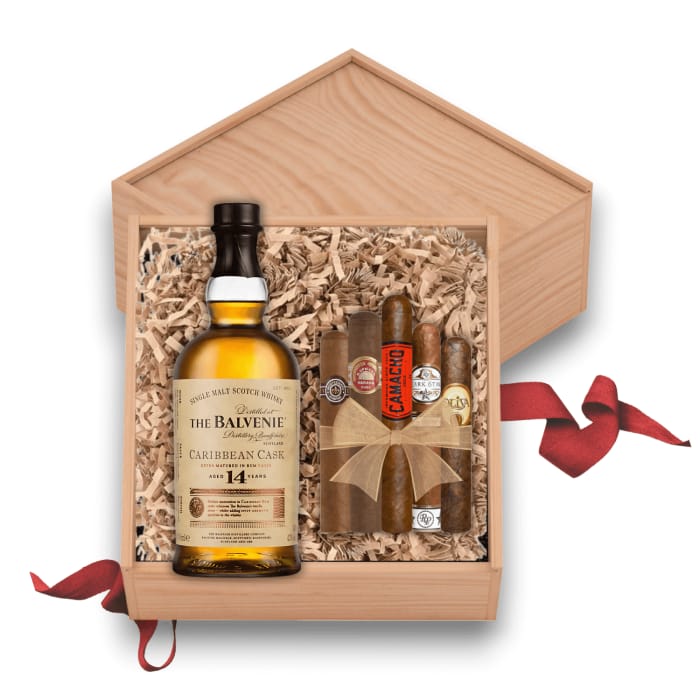 In addition to this sumptuous Speyside single malt, each Balvenie Gift Set With Cigars also comes packaged with a selection of 5 fine cigars packaged with the bottle inside a lovely wooden gift box.
