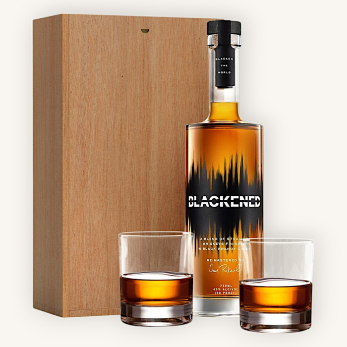Each batch of the Blackened Whiskey begins with a selection of straight whiskeys sourced from different distilleries across North America. The whiskey undergoes a process known as "Black Noise" where the blended whiskeys are put in "black brandy barrels" and for weeks constantly bombarded with low-hertz sound. This agitates the spirits within, allowing them to absorb more of the wood’s flavor resulting in a richer, smoother whiskey then tamed with pure water and bottled at a hearty 90 proof.