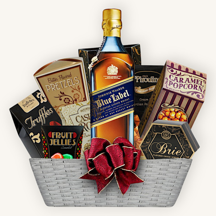 Why treat friends and loved ones to a single bottle of blended Scotch when you can send a luxurious Johnnie Walker Blue Label Gift Basket?
